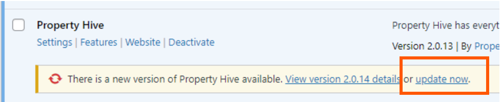 Update the plugin by navigating to 'Plugins' from the left-hand menu, locate the Property Hive plugin, and click 'Update Now':