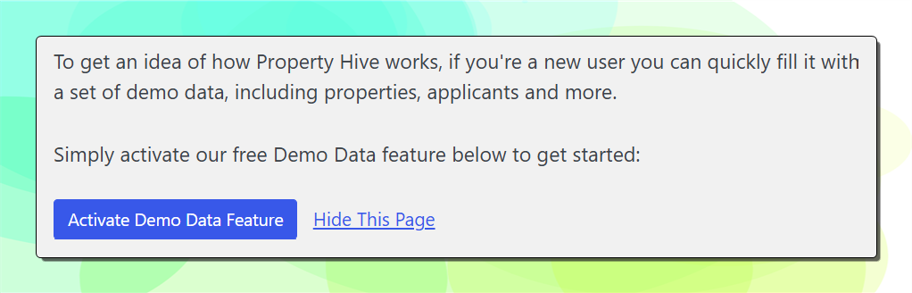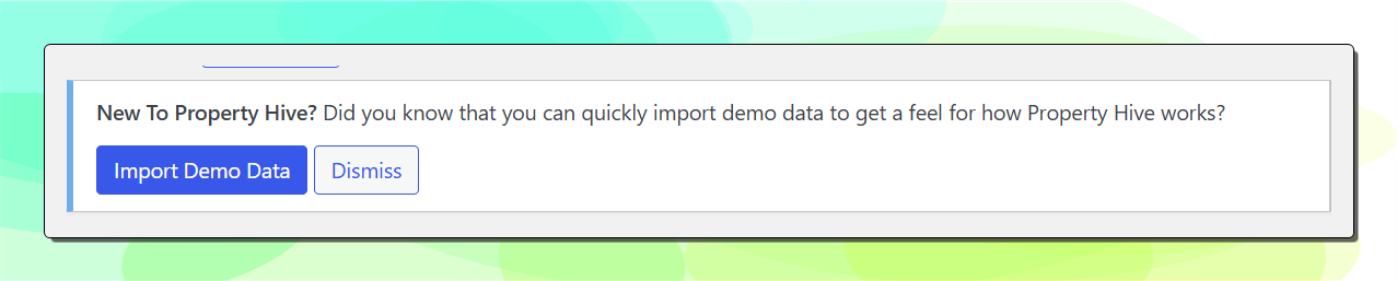 ℹ️ If you've dismissed this message or don't see it, you can find the option again at any time by navigating to 'Property Hive' > 'Settings' > 'Demo Data'.