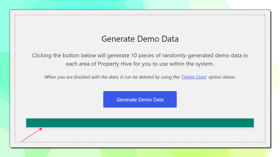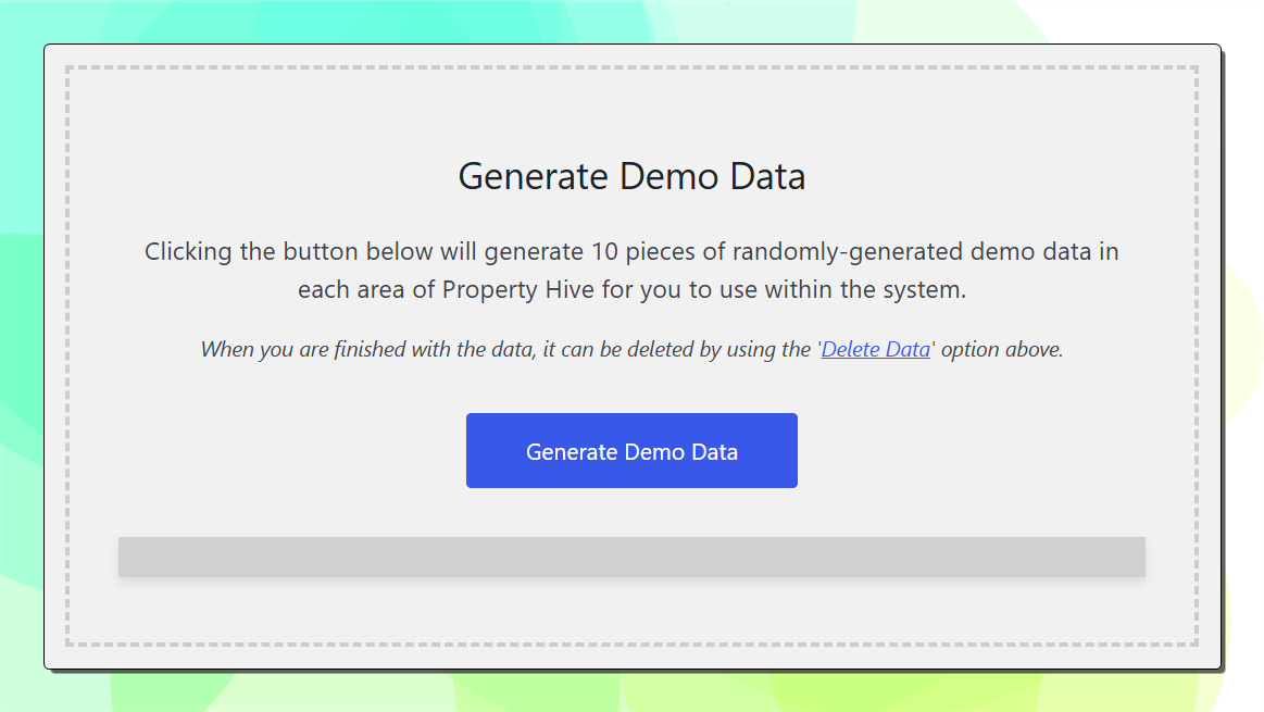 When the green bar is full, the demo data generation is complete. Each time you click the 'Generate Demo Data' button, 10 random data items for different sections of Property Hive are generated (properties, contacts, viewings etc.).