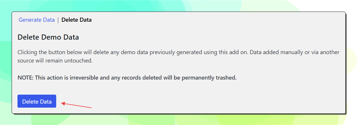ℹ️ Note that deleting data via this method will only delete demo data and will ignore any data inserted from another sources (e.g. entered manually or imported).
