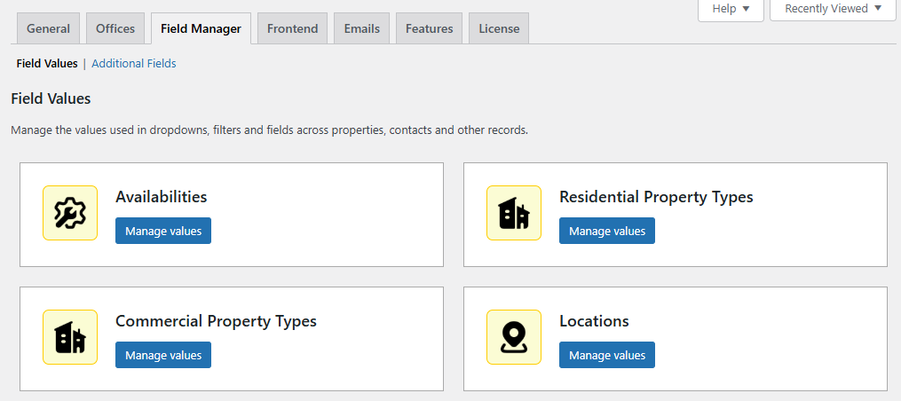 To access and customise the custom fields navigate to 'Property Hive > Settings > Field Manager > Field Values':
