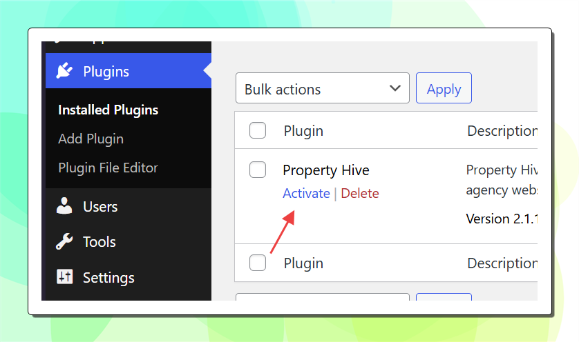 The easiest way to install the Property Hive plugin is through WordPress itself. By completing the installation this way, WordPress handles the download and installation of files on your behalf, without you having to leave the browser. This makes it quicker to get started and is also great if you're not comfortable with moving files around.