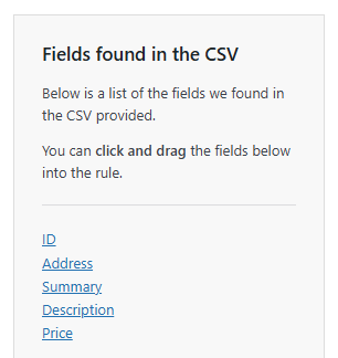 If the format being used is XML or CSV, on the right hand side you’ll have a list of all the fields we found in the external file: